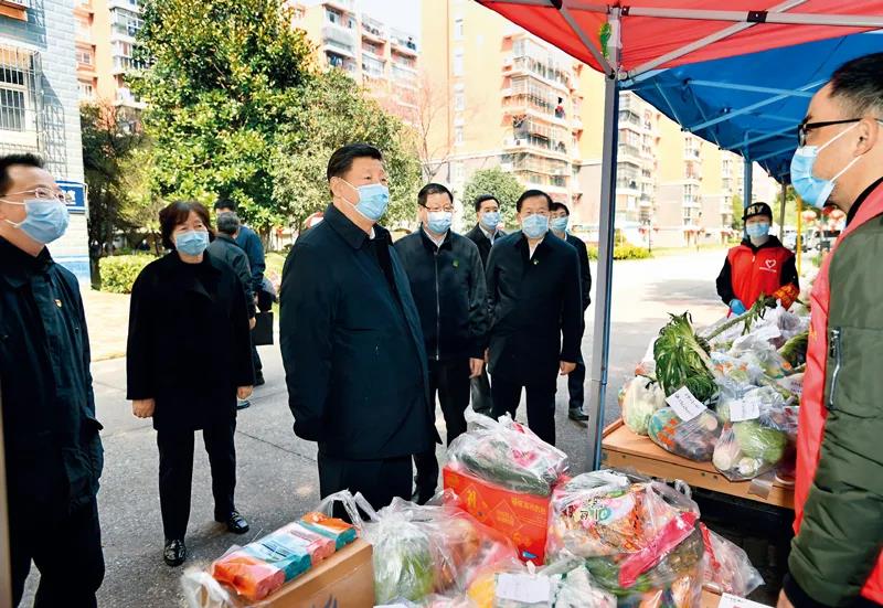 2020年3月10日,中共中央总书记、国家主席、中央军委主席习近平专门赴湖北省武汉市考察新冠肺炎疫情防控工作。这是习近平在东湖新城社区生活物资集中配送点,详细询问社区群众生活物资采购和供应情况。新华社记者 谢环驰/摄