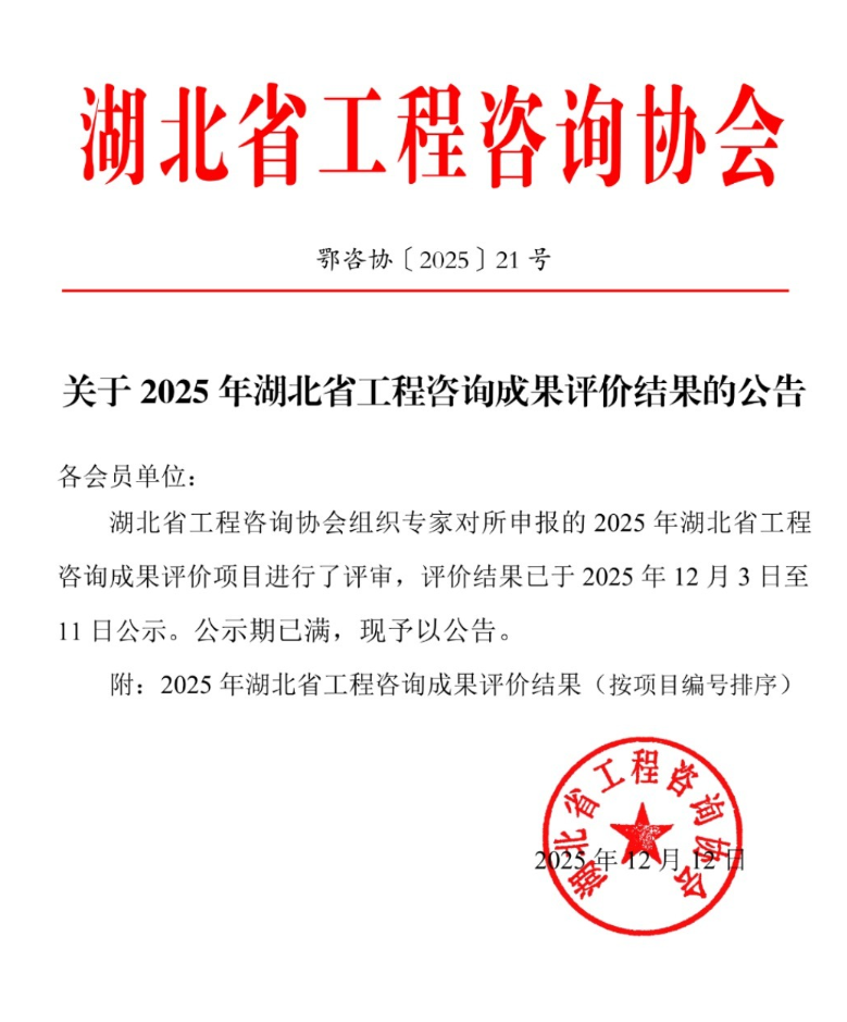 近日,湖北省工程咨询协会发布了《2025年度湖北省工程咨询成果评价结果公告》。中乾立源凭借扎实的专业功底与优质的咨询服务,两个项目成果在此次年度成果评价中表现优异,成功入选公告名单。其中,《三亚崖州湾科技城亚洲农业研究中心项目可行性研究报告》被评定为二等成果,《三亚崖州湾科技城HJSYS三亚基地项目建议书评审报告》被评定为三等成果。